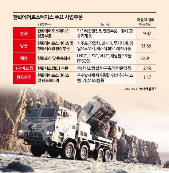 한화에어로스페이스의 주력은 K9 자주포와 천무 다연장로켓, 레드백 장갑차 등 방산 부문이다. 러시아와 국경을 마주한 북대서양조약기구(NATO·나토) 회원국 폴란드의 계약을 시작으로 대규모 수출 계약이 지속되며 실적과 주가 상승을 이끌었다. 항공 부문의 경우 군수는 KF-21, FA-50 등 국산 전투기에 들어가는 F404, F414 엔진을 라이선스 생산하는 한편 엔진 국산화 연구개발을 진행하고 있다. 민수 부문은 GE, 롤스로이스, P&W 등 전문 메이저 엔진 업체에 부품을 납품하고 있다.