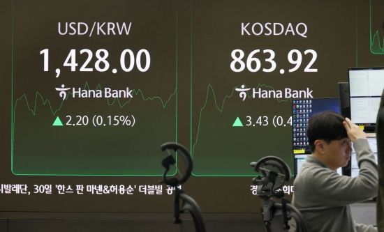 원/달러 환율이 장초반 상승하고 있는 가운데 14일 서울 중구 하나은행 딜링룸 현황판에 원/달러 환율이 표시돼 있다.