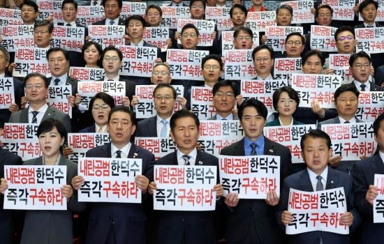 정청래 대표와 김병기 원내대표를 비롯한 더불어민주당 의원들이 14일 국회 로텐더홀 계단에서 한덕수 등 국무위원 내란공모 규탄 기자회견을 하고 있다.
