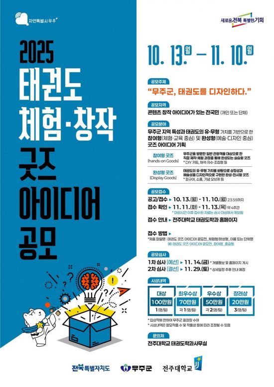 이번 공모전은 전북도, 무주군, 전주대가 공동으로 추진하는 사업으로, '무주군, 태권도를 디자인하다'를 주제로 지역의 정체성과 태권도의 문화적 가치를 결합한 창의적인 굿즈 아이디어를 발굴하기 위해 기획됐다.