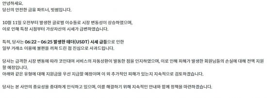 빗썸은 "급격한 시장 변동에 따라 코인 대여 서비스의 자동상환이 발동한 점을 인지했다"며 "피해가 발생한 회원님들의 손실에 대해 전액 지원할 예정"이라고 설명했다.