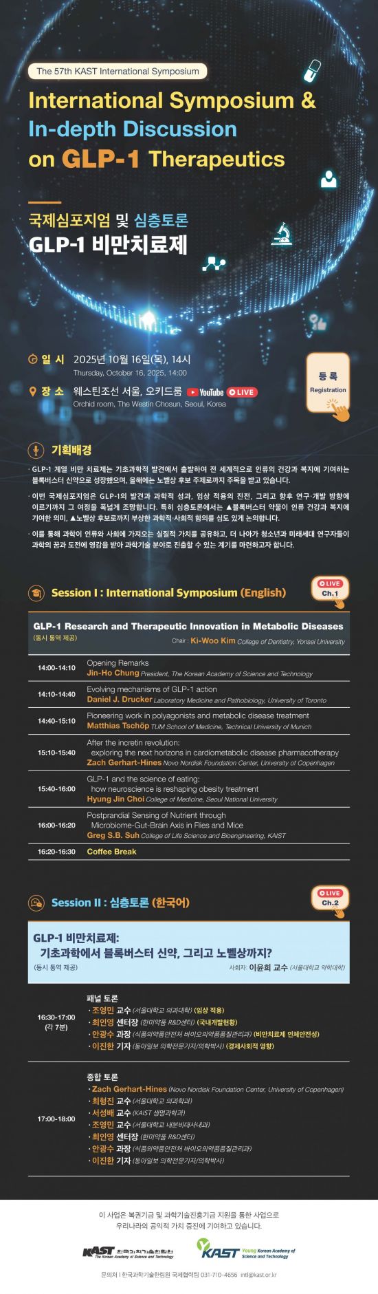 정진호 원장은 "GLP-1 치료제는 기초과학적 발견이 어떻게 인류 건강과 사회적 가치로 이어질 수 있는지를 보여주는 대표 사례"라며 "이번 심포지엄이 국민이 과학성과의 의미를 이해하고, 관련 연구자들이 폭넓게 교류하는 계기가 되길 바란다"고 말했다.