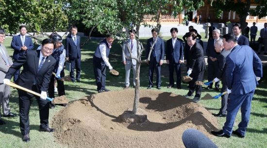우원식 국회의장과 노사 5단체 대표들이 15일 국회 사랑재에서 열린 사회적 대화 공동선언식에서 기념식수를 하고 있다. 앞줄 왼쪽부터 우원식 국회의장, 김동명 한국노총 위원장, 양경수 민주노총 위원장. 앞줄 오른쪽부터 최태원 대한상공회의소 회장, 김기문 중소기업중앙회 회장, 손경식 한국경영자총협회 회장.