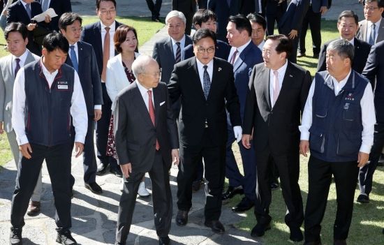 우원식 국회의장과 노사 5단체 대표 등 참석자들이 15일 국회 사랑재에서 열린 사회적 대화 공동선언식에서 기념 식수를 마치고 행사장으로 이동하고 있다.