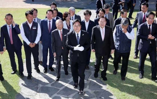 우원식 국회의장과 노사 5단체 대표 등 참석자들이 15일 국회 사랑재에서 열린 사회적 대화 공동선언식에서 기념 식수를 마치고 행사장으로 이동하고 있다.