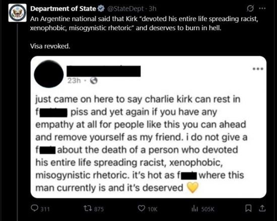 국무부가 게시한 글에 따르면 이번에 비자가 취소된 아르헨티나인은 커크에 대해 "인종차별, 외국인 혐오, 여성 혐오 수사를 퍼뜨리는 데 평생을 바쳤다"고 했다. 한 독일 국적자는 "파시스트가 죽어도 민주주의자들은 불평하지 않는다"고 썼다.