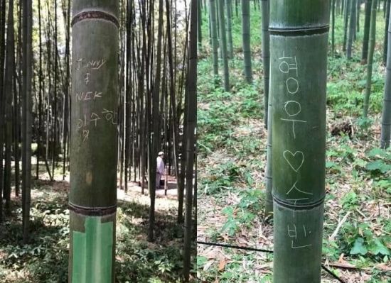 일본 교토의 명소인 '아라시야마 대나무숲'이 관광객 낙서로 몸살을 앓고 있다. 교토시가 훼손된 대나무를 베어내는 방안까지 검토 중이다. 15일(현지시간) 아사히신문은 신종 코로나바이러스 감염증(코로나19) 대유행 이후 아라시야마 명소인 대나무 숲의 관광객 수가 다시 증가하면서 낙서 피해가 증가하고 있다고 보도했다. 교토시가 지난 6일 아라시야마 일대 2.3㏊(헥타르) 규모의 죽림을 조사한 결과 약 7000그루 중 350그루에서 낙서 흔적이 발견됐다. 낙서는 대부분 칼, 열쇠 등 날카로운 물체로 새겨진 것으로 추정됐다.
