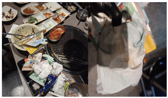 제보자가 공유한 사진을 살펴보면 테이블의 불판 옆에 아이가 먹은 간식으로 보이는 봉지들이 다수 어지럽게 버려져 있었다. 여기에 사용한 물티슈와 빈 음료 사이에는 아이의 것으로 보이는 기저귀까지 확인됐다.