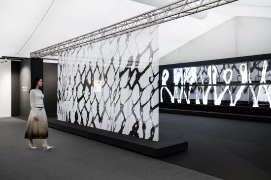 LG전자가 프리즈 런던에서 수묵 추상의 거장 고(故) 서세옥 화백의 작품을 재해석한 미디어아트를 선보인다. 사진은 반투명 패브릭 너머로 전시 공간을 감상하는 모델의 모습. LG전자.