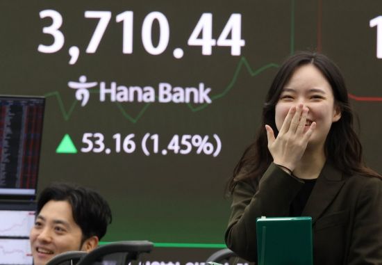 코스피가 장중 연고점을 찍으며 거침없이 상승하고 있는 16일 서울 중구 하나은행 딜링룸 현황판에 코스피 지수 등이 표시되고 있다. 이날 코스피 지수는 전 거래일 대비 18.54포인트(0.51%) 오른 3,675.82에, 코스닥은 2.10포인트(0.24%) 오른 866.82에 개장했다.