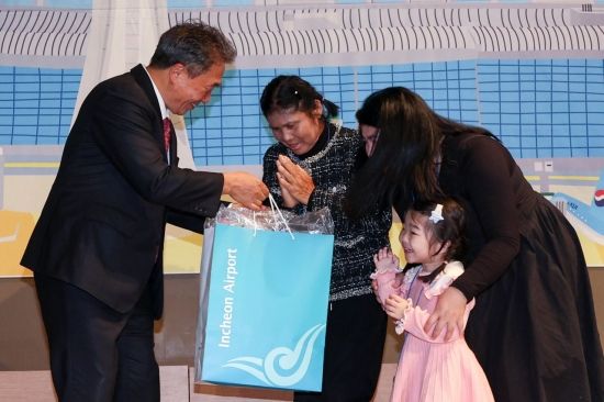 이학재 인천국제공항공사 사장이 16일 인천 중구 인천국제공항공사 항공교육원에서 열린 '다문화가족 부모초청 환영행사'에서 국가별 대표 가정에게 기념품을 전달하고 있다.