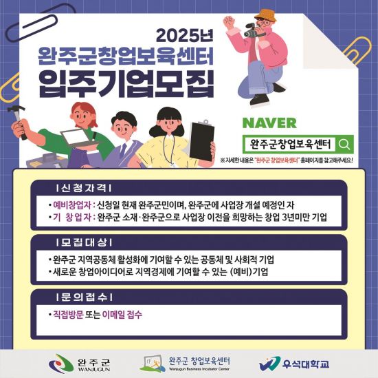 전북 완주군 창업보육센터가 입주기업 기간 만료에 따라 입주기업을 내달 7일까지 모집한다.