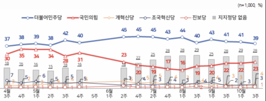 16일 엠브레인퍼블릭·케이스탯리서치·코리아리서치·한국리서치의 전국지표조사(NBS·13~15일 전국 18세 이상 남녀 1000명을 대상으로 휴대전화 면접 방식으로 진행·표본오차는 95% 신뢰수준에서 ±3.1%포인트·응답률 15.8%)에 따르면 민주당 지지율은 2주 전(10월 1주) 조사와 비교해 2%포인트 하락한 39%를 기록했다. 지난 대선에서 승리한 이후 민주당은 40% 초중반의 지지율 흐름을 이어왔지만 이번 추석 연휴를 거치면서 처음으로 40%대 벽이 깨졌다.