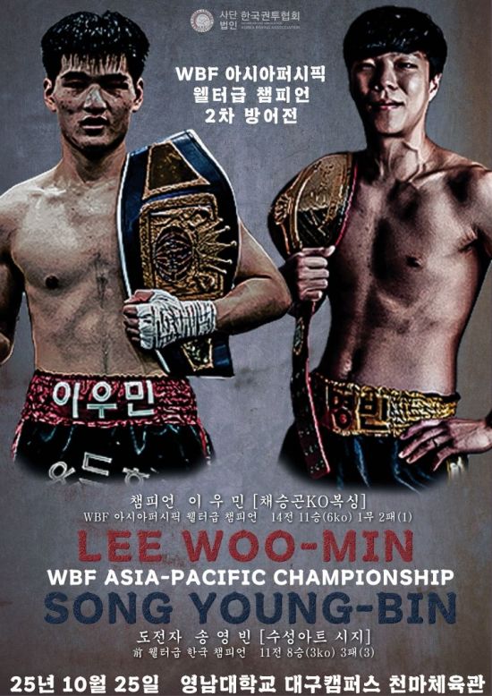 한국권투협회 대구지회 주최로 열리는 이번 대회는 오픈게임(7경기)에 이어 챔피언 이우민 선수(전남 영광군·채승곤KO복싱)와 전 웰터급 한국챔피언 출신인 도전자 송영빈 선수(대구·수성아트 시지)의 WBF 동양타이틀을 놓고 불꽃 튀는 경기가 펼쳐진다.