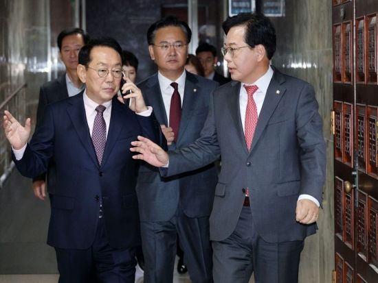 송언석 국민의힘 원내대표와 김도읍 정책위의장 등 원내지도부가 17일 국회에서 열린 국정감사대책회의에 참석하고 있다.