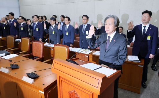 정기석 국민건강보험공단 이사장을 비롯한 기관 증인들이 17일 국회 보건복지위에서 열린 2025년도 건강보험공단과 건강보험 심평원에 대한 국정감사에서 증인 선서를 하고 있다.