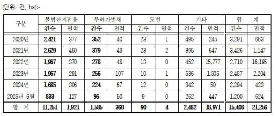 피해 면적으로는 기타 항목이 1만8971㏊로 가장 넓고 불법 산지전용 1921㏊, 무허가 벌채 360㏊, 도벌 4㏊ 등이 뒤를 이었다.