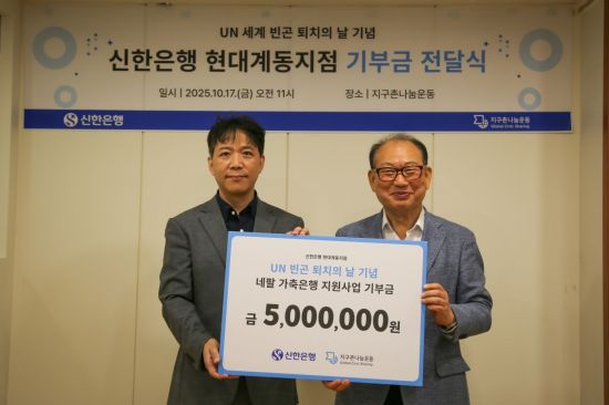 지구촌나눔운동(이사장 김혜경)은 신한은행 현대계동지점(지점장 신승현)이 UN 세계 빈곤퇴치의 날(10월 17일)을 맞아 빈곤퇴치 기부금을 전달했다고 밝혔다. 전달된 기부금은 네팔 저소득 취약계층 무사허르(Musahar) 공동체 대상 가축은행 사업에 지원될 예정이다. 해당 사업은 네팔 최하층 가정에 염소를 지원하고, 축산 및 금융 교육을 병행하여 자립형 생계 기반을 마련하도록 돕는 프로그램이다.