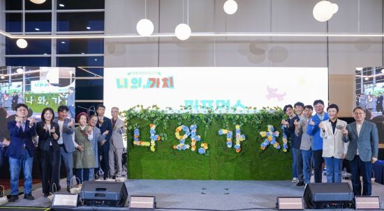 18일 오후 광주시청 시민홀에서 열린 '제4회 광주사회적경제 박람회'에서 행사에 참석한 강기정 시장과 전진숙·정준호 의원 등 내빈들이 퍼포먼스를 하고 있다. 광주시 제공