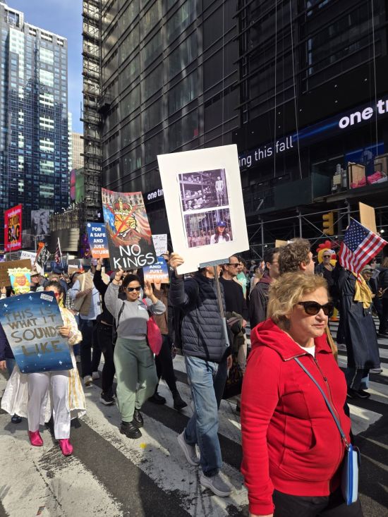 지난 18일(현지시간) 정오께 뉴욕 맨해튼 타임스스퀘어 일대. 거대한 인파로 뒤덮인 현장에서 만난 한 시민은 기자에게 "트럼프는 퇴진해야 한다"며 이같이 말했다. 그는 도널드 트럼프 미국 대통령의 국정 운영에 반대하며 전국 규모로 개최된 '노 킹스(No Kings·왕은 없다)' 시위 참가자였다. 시민들은 "노 킹스"라는 구호와 함께 "미국의 가치가 사라졌다" "우리는 왕이 아닌 민주주의를 원한다"고 외치며 트럼프 대통령의 권위주의적 행태를 규탄했다. 도심 차량 통행이 통제된 가운데 수많은 시민이 행진했으며, 폭력 사태에 대비해 뉴욕경찰청(NYPD)이 곳곳에 경찰 병력을 배치했지만 시위는 축제 분위기 속에 전반적으로 평화롭게 진행됐다.
