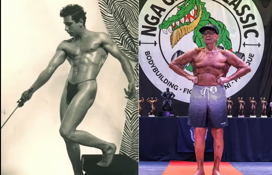 17세이던 1942년 '스트렝스앤머슬매거진'(Strength and Muscle Magazine)에 실린 사진과 100세이던 올해 5월 '내셔널짐어소시에이션'(National Gym Association)의 게이터클래식(Gator Classic) 부문 무대에 선 모습. 데일리메일