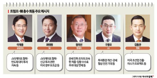 20일 재계에 따르면 이재용 삼성전자 회장, 최태원 SK그룹 회장, 정의선 현대자동차그룹 회장, 구광모 LG그룹 회장, 김동관 한화그룹 부회장 등 재계 총수들은 지난 18일(현지시간) 미국 플로리다에서 열린 골프 회동에서 트럼프 대통령과 만난 것으로 알려졌다.