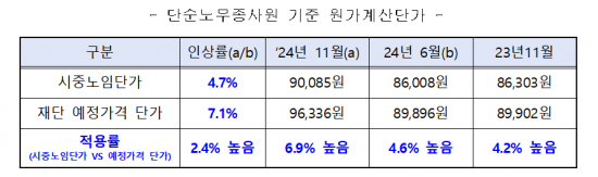 이어 "노조가 주장하는 단순노무직군 시중노임단가 인상률 4.7%를 적용해 전체 노무비를 4.0% 올려달란 것은 용역근로자 근로조건 보호지침 규정과 다르다"라고 했다.
