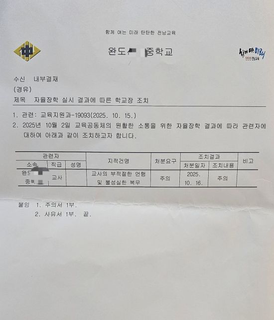 상황이 심각해지자 일부 학부모들은 완도교육지원청과 학교 측에 정식 민원을 제기했고, 이에 따라 교육지원청은 현장 조사를 실시해 B씨의 부적절한 언행과 복무 태도를 확인한 뒤, 전남도교육청에 보고했다.