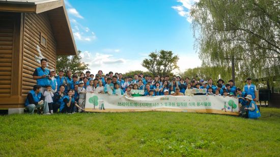 브라이트에너지파트너스 임직원과 가족 100여 명이 지난 17일 서울 마포구 노을공원에서 '꿀숲벌숲 캠페인' 나무심기와 씨앗 심기, 그림 그리기 활동을 함께 진행하고 기념 촬영을 하고 있다. 브라이트에너지파트너스