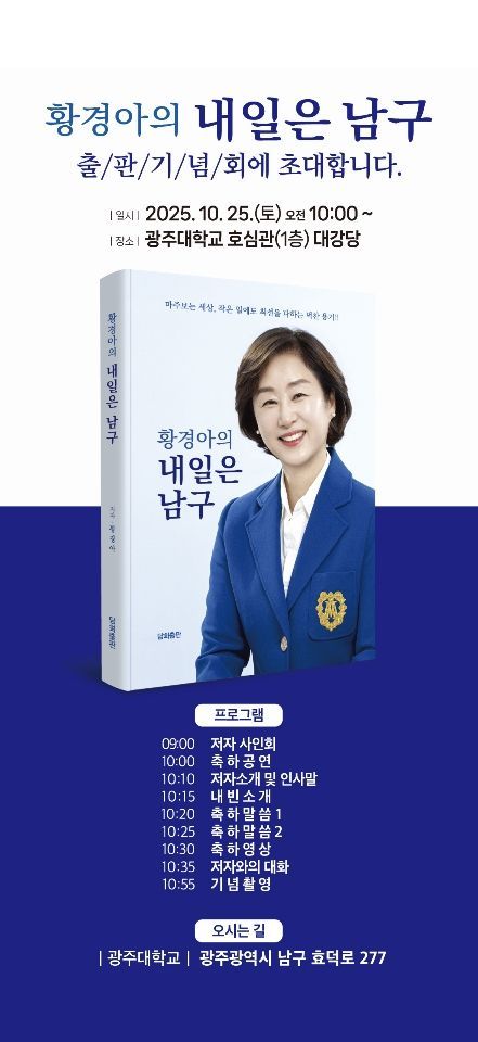 21일 황경아 광주 남구의원에 따르면 오는 25일 오전 10시 광주대학교 호심관 대강당에서 본인의 의정 생활을 풀어낸 '내일은 남구' 출판 기념회를 진행한다.