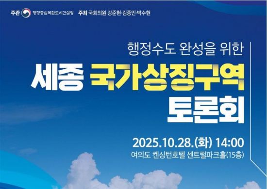 행정중심복합도시건설청이 강준현·김종민·박수현 국회의원실과 공동으로 이달 28일 서울 켄싱턴호텔에서 전문가와 시민이 함께하는 '세종 국가상징구역 토론회'를 개최한다.