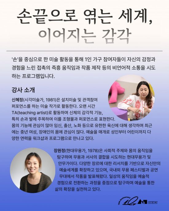 참여자들은 시각예술가 신혜정과 현대무용가 장원정의 협업으로 몸의 움직임과 손의 감각을 탐구하며, 즉흥적인 드로잉과 조형 작업을 결합한 창작 과정을 경험할 수 있다. 아울러 '손금 드로잉'과 '반짝이는 손 조형작품' 제작 활동을 통해 내면의 감정과 감각을 시각적으로 형상화하며, 예술을 통해 자신과 타인을 새롭게 인식하는 시간을 갖게 된다.