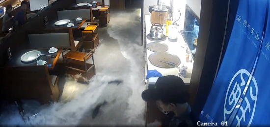 공개된 영상에서는 수족관 유리가 깨지면서 수많은 물고기가 쏟아져 나왔다. 주방은 물론 손님들이 식사하는 내부까지 흘러나오면서 마치 계곡의 급류처럼 형성됐고, 놀란 직원들은 황급하게 도망치기도 했다.