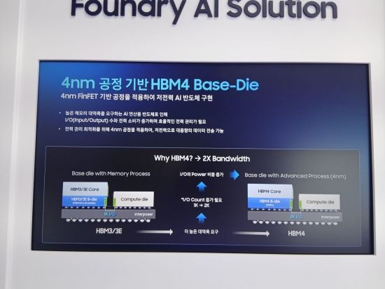 이번 전시에서 6세대 고대역폭메모리(HBM4) 12단 제품의 실물을 처음으로 우리나라 대중 앞에서 공개하면서 HBM4의 베이스 다이를 자사 파운드리의 4나노 공정으로 만든다는 점도 홍보해 눈길을 끌었다. 베이스 다이는 HBM의 맨 아래에서 메모리 동작 제어와 데이터 분배를 담당하는 일종의 '받침'이다. HBM4부터는 베이스 다이도 AI 연산의 효율을 높이고 에너지를 관리하는 등 그 기능이 더욱 적극적으로 변모하며 기업들도 베이스 다이 생산 공정을 선택하는 데 있어 신중을 기하고 있다. 삼성은 자사의 4나노 기반 파운드리를 통해 베이스 다이로 만들기로 하며, 대만 TSMC에 베이스 다이 생산을 맡기는 타사들과는 차별성을 두려 하고 있다. 이번 전시에서도 삼성은 이를 부각하고자 HBM4 전시와는 별도로 내용을 설명하는 영상을 설치했다.