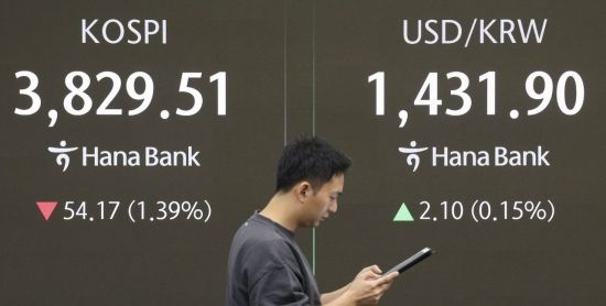 코스피 지수가 전 거래일 대비 51.30포인트 하락한 3832.38에 거래를 시작한 23일 서울 중구 하나은행 딜링룸에서 딜러들이 업무를 보고 있다. 이날 원달러 환율은 한국은행의 금리 결정을 앞두고 1430원대로 개장했다.