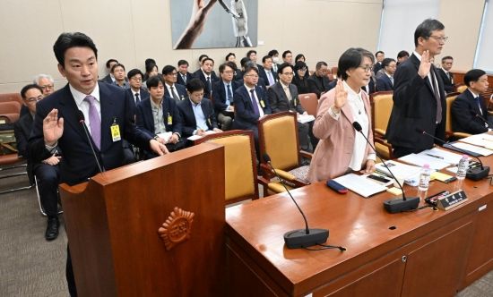 박장범 한국방송공사 사장이 23일 서울 여의도 국회 과학기술정보방송통신위원회에서 열린 한국방송공사(KBS), 한국교육방송공사(EBS), 문화방송(MBC) 대주주 방송문화진흥회 등에 대한 국정감사에서 증인선서를 하고 있다.