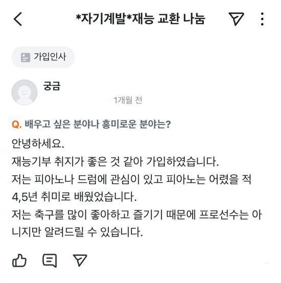 직장인 김상진씨(33)는 어렸을 때 쳤던 피아노를 다시 배우고 싶어 최근 중고거래 플랫폼 '당근'에 글을 올렸다. '축구를 가르쳐줄 테니 피아노 연주를 알려달라'는 내용이었다. 김씨는 이러한 재능 교환에 관해 "재능도 능력 자본이고, 돈 없이 각자의 재능을 나눌 수 있다는 장점이 있다"며 "남는 시간에 능력도 하나 더 갖출 겸 유의미한 일을 해보고 싶었다"고 말했다.