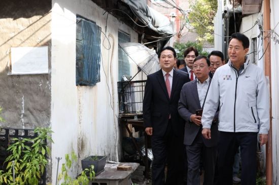 송 원내대표는 "정부는 더 좋은 아파트에서 살 수 있도록 공급을 늘려줘야 한다"며 재개발·재건축 요건을 완화해야 한다"고 말했다. 김도읍 정책위의장은 이날 오전 국정감사 대책회의에서 재건축초과이익환수제(재초환) 폐지법을 이번 정기국회에서 여야 합의로 처리할 것을 제안했다. 오 시장 역시 "특위 지원으로 사업이 빠른 속도로 진척되지 않을까 기대한다"고 합을 맞췄다.