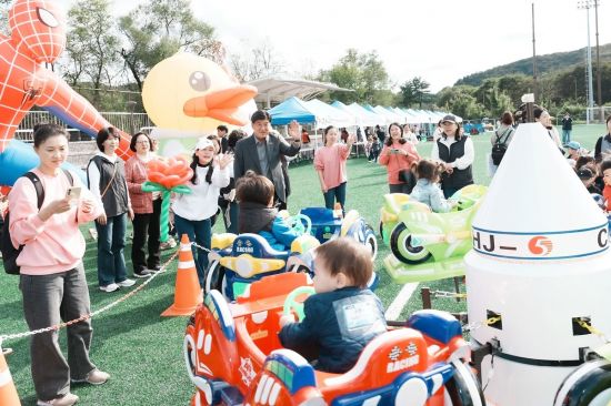 특히, '장난감 입양' 부스에서는 사용하지 않는 장난감을 서로 교환하며 자원 재활용의 가치와 나눔의 의미를 배우는 뜻깊은 시간이 마련됐다. 또한, 행사장 중앙에는 에어바운스, 미끄럼틀, 터널 등 다양한 놀이시설이 설치돼 영유아들이 마음껏 뛰어놀며 감정 표현력과 사회성을 자연스럽게 기를 수 있는 놀이 공간이 조성됐다.