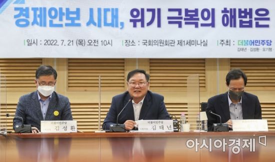 김태년 더불어민주당 경제위기대응특위 위원장이 21일 국회 의원회관에서 열린 경제위기대응특별위원회 주최 세미나 '경제안보 시대, 위기 극복의 해법은 무엇인가?'에 참석, 축사를 하고 있다./윤동주 기자 doso7@