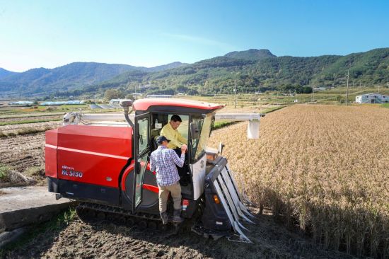 이상근 경남 고성군수가 27일 친환경 벼 재배단지(연동단지)를 방문해 수확 현장을 점검하고, 깨씨무늬병 발생으로 어려움을 겪고 있는 농업인들을 격려했다.