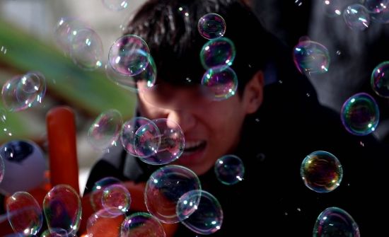 27일 오후 서울 종로구 광화문광장에서 열린 제3회 지구하다 페스티벌을 찾은 학생들이 자전거 페달을 이용한 발전기로 비눗방울을 만들며 힘들어 하고 있다.