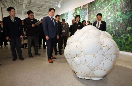 최태원 SK그룹 겸 대한상공회의소 회장이 28일 경상북도 경주시 사정동 플레이스C 갤러리에서 열린 ‘APEC CEO SUMMIT 2025, 배우자 미술전시 오프닝’에 참석해 전시를 둘러보고 있다.