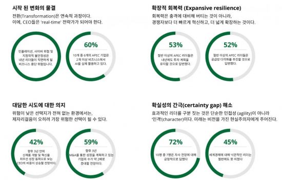 18개 경제권의 1250여 명의 리더가 참여한 이번 보고서에서 CEO들은 불확실성 속 핵심 경영 키워드로 '확장적 회복력(Expansive Resilience)'을 꼽았다. 확장적 회복력이란 단순히 불확실성과 위기에 대응하는 수준을 넘어, 외부 충격을 새로운 목표와 성장 기회로 전환하며 적극적인 변화와 성장을 주도하는 리더십을 의미한다.