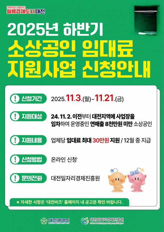 신청은 11월 3일부터 21일까지 온라인으로 접수하며, 신청 대상은 공고일 기준 1년 이상 대전시에서 사업장을 임차해 운영 중인 소상공인으로, 연 매출액 8000만 원 미만이어야 한다.