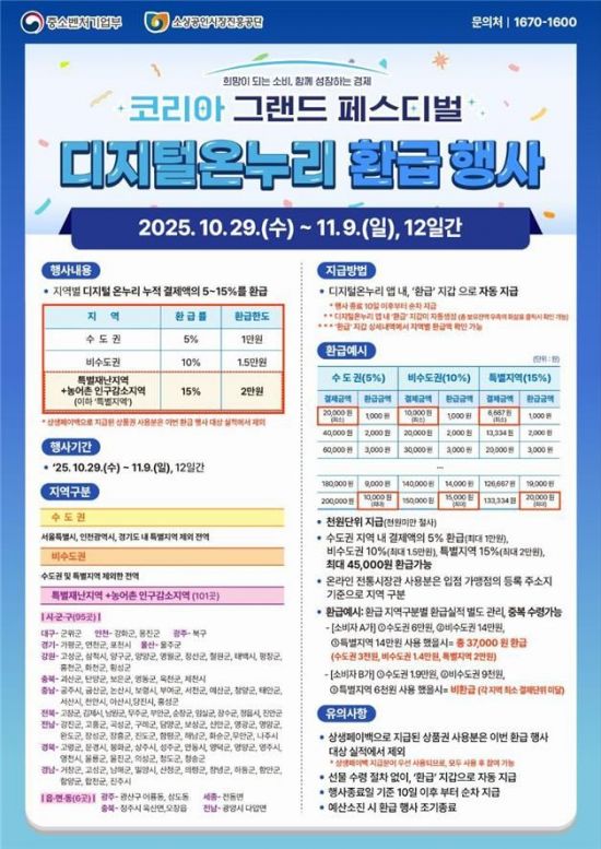 디지털 온누리상품권 환급행사도 같은 기간 진행된다. 디지털 온누리상품권으로 결제한 소비자에게 누적 결제금액의 5~15%를 동일한 디지털 온누리상품권으로 환급해준다.