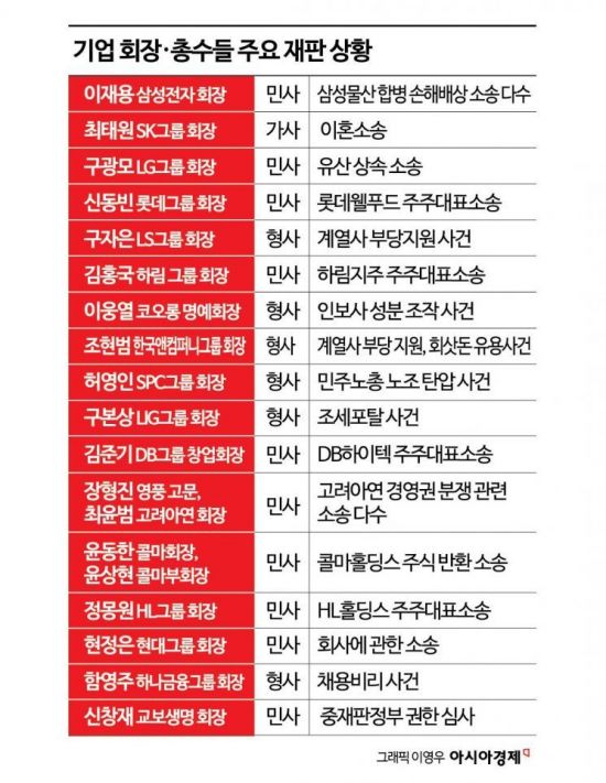 최소 30명 이상의 창업주와 회장 등 대기업 및 중견·중소기업, 금융사를 실질적으로 지배하는 경영인들이 여러 송사에 시달리고 있는 것으로 나타났다. 법률신문이 지난 24일 기준 진행 중인 사건을 확인한 결과, 이들은 형사사건 16건의 피고인으로 재판을 받고 있다. 민사소송 12건, 가사소송 2건도 있었다.