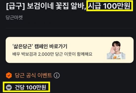 중고거래 플랫폼 당근에 등장한 이색 아르바이트 모집 공고가 온라인상에서 화제다. '시급 100만원'이라는 파격적인 조건과 배우 박보검의 참여로 관심을 끌고 있다.