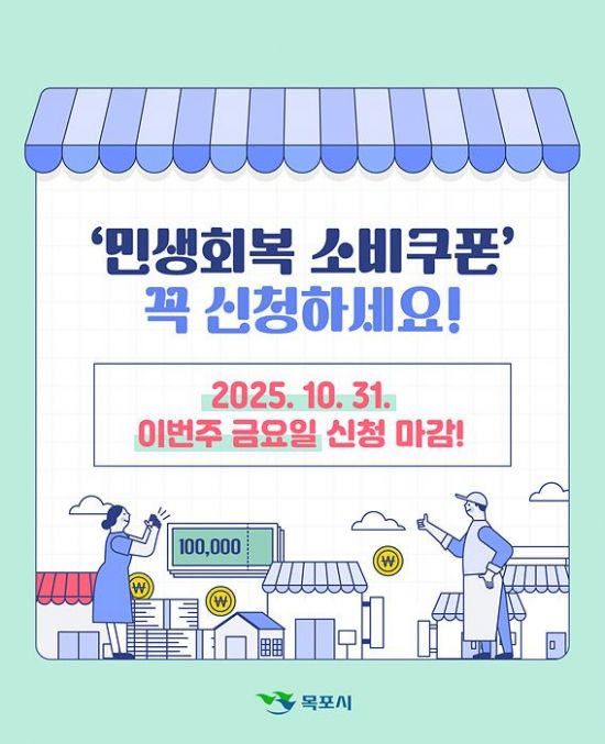 전남 목포시가 '2차 민생회복 소비쿠폰' 신청 마감일이 오는 31일 오후 6시임을 알리며 시민들의 적극적인 참여를 당부했다.