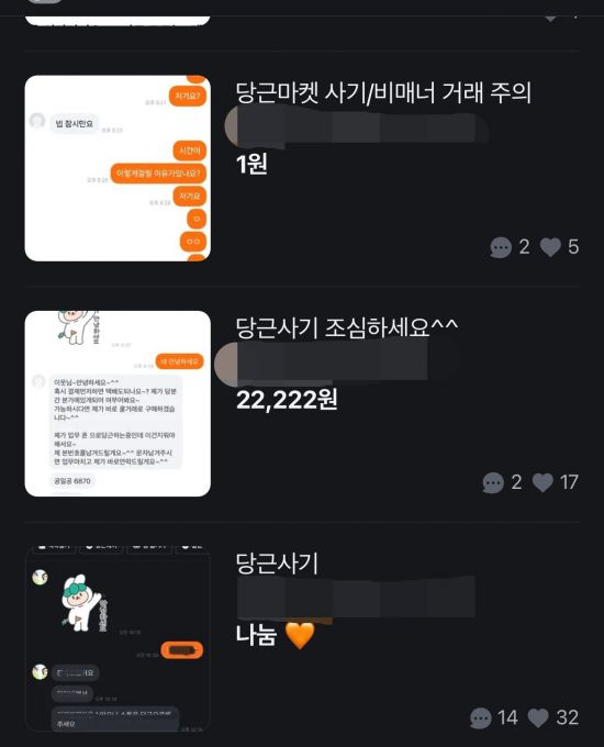 문제는 이렇게 대여한 당근 계정이 중고 사기에 이용됐다는 것이다. 피해 사례를 보면 동네 인증을 해준다던 사기범은 넘겨받은 후 해당 아이디로 중고 사기 글을 올렸다. 아이디와 비밀번호를 넘겨준 이용자들은 대리 인증을 해준다는 이용자의 높은 매너 온도를 보고 신뢰감을 갖게 됐다고 입 모아 말했다.